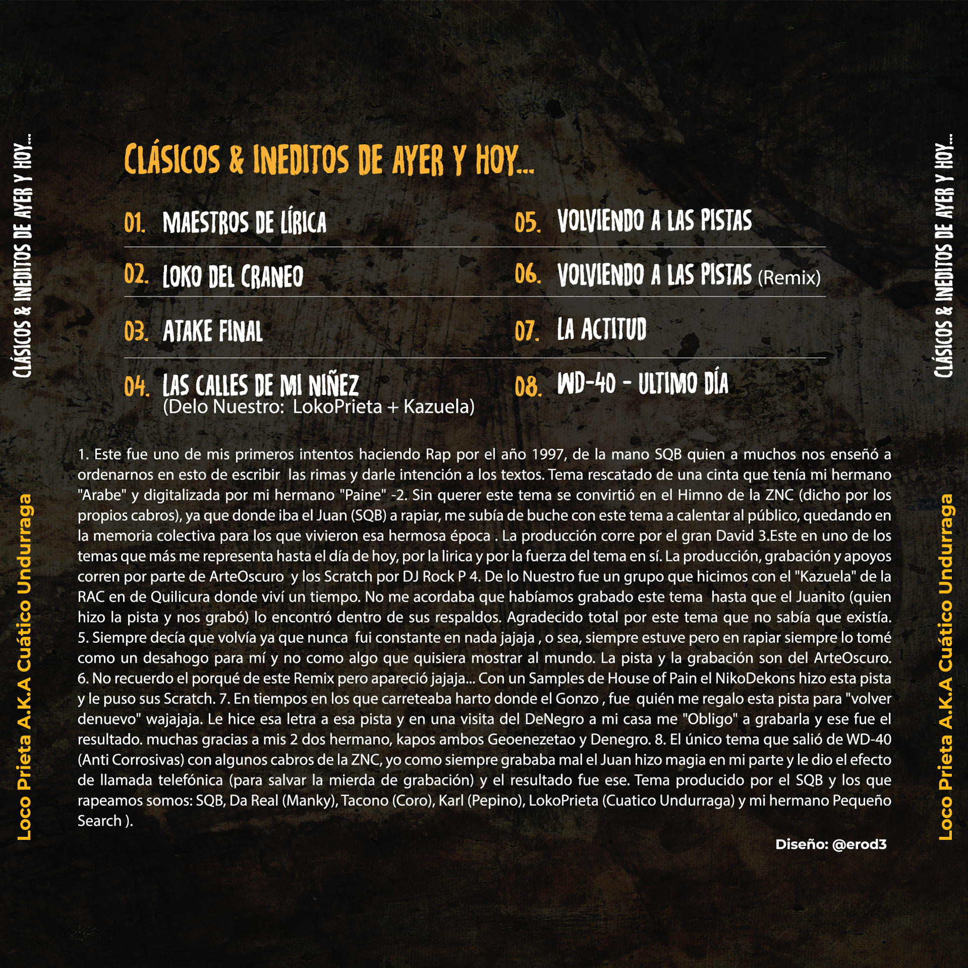 Diseño de carátula para el rapero El Prieta (ZNC): Proyecto desarrollado integralmente, desde la conceptualización creativa hasta la producción final. Se trabajó en la idea para la dirección y realización de la sesión fotográfica, el diseño del tag con un lenguaje visual coherente con la identidad rapera del artista y la creación del arte final para la impresión de la carátula y el disco físico.
