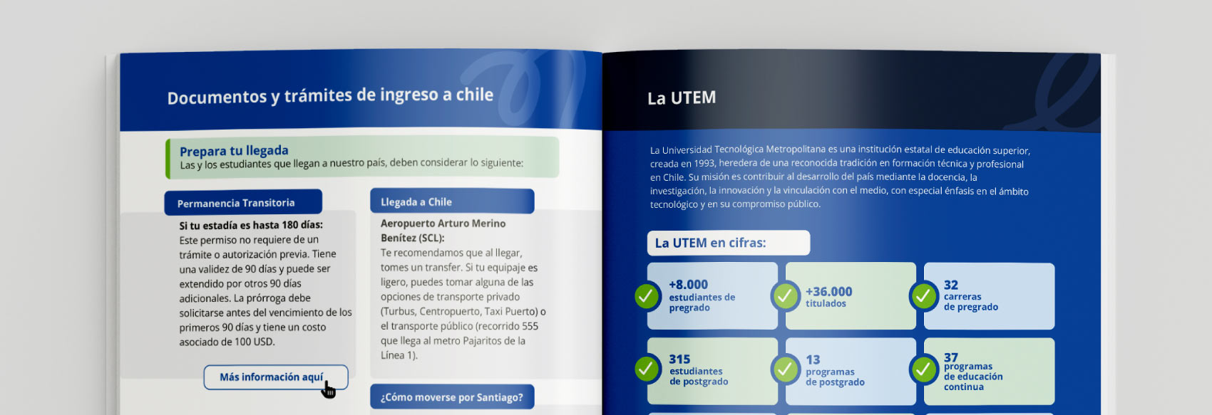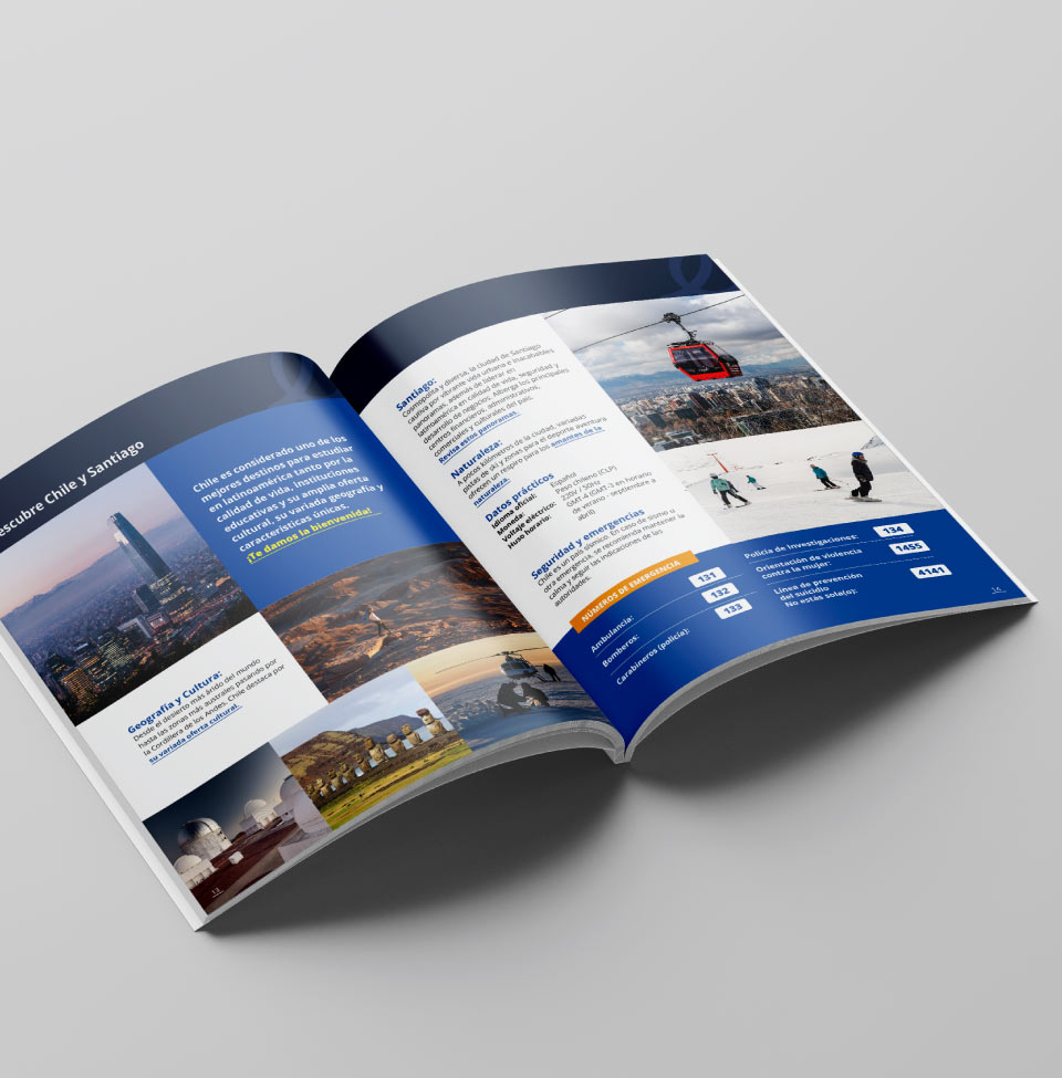 Para el desarrollo de esta guía se aplicaron los lineamientos del manual de marca institucional, resguardando la coherencia visual y la identidad gráfica de la universidad. El proyecto incluyó la estructuración editorial de contenidos, el diseño de retículas y jerarquías tipográficas, así como la adaptación del material para su distribución en formatos digitales e impresos, garantizando claridad, legibilidad y una experiencia de lectura accesible para estudiantes internacionales.