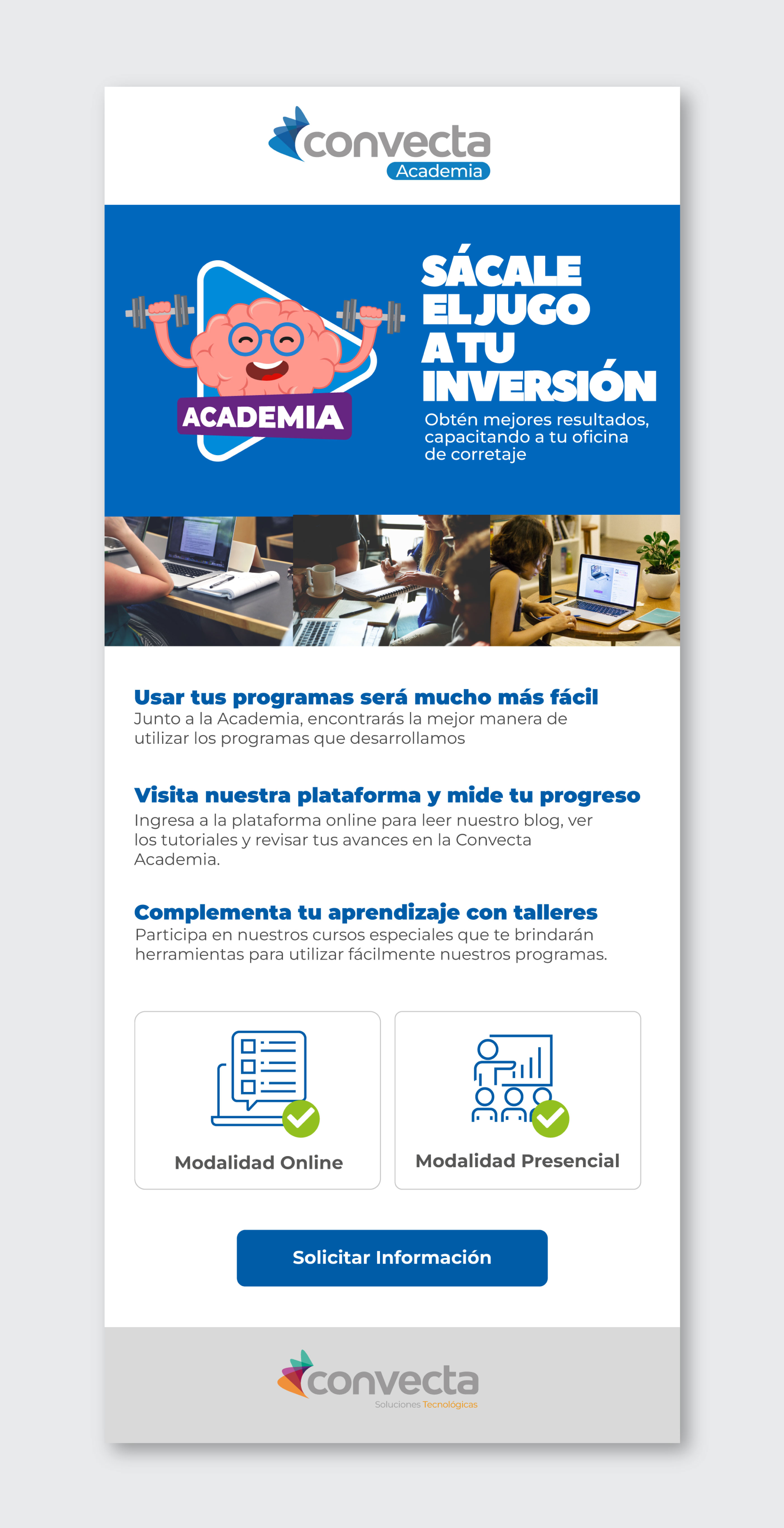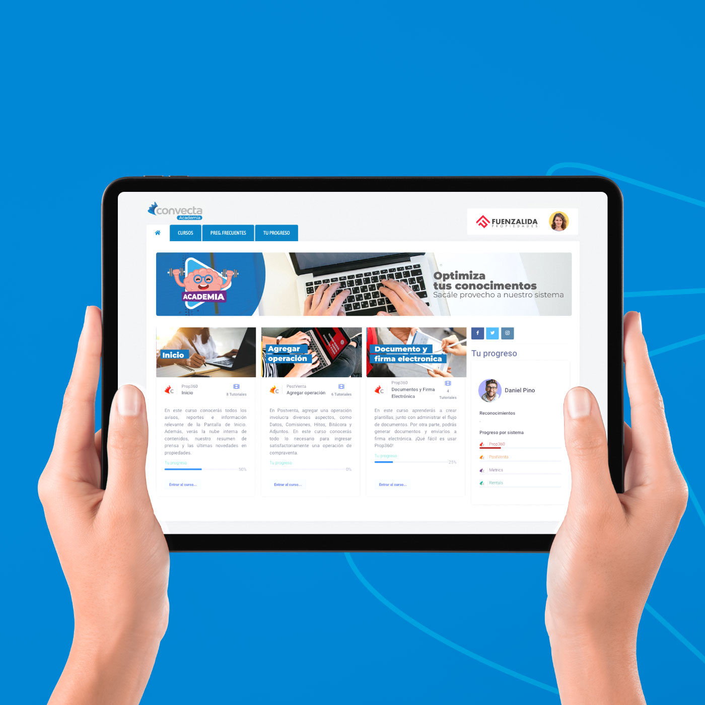 Convecta ha lanzado una nueva plataforma digital con el objetivo de fidelizar y motivar a sus más de 300 usuarios a explorar herramientas de la aplicación prop360 que no conocen ni han utilizado anteriormente. En este proyecto, mi labor consistió en desarrollar una marca secundaria que representara este nuevo servicio, además de crear contenido publicitario para canales online y brindar apoyo en el desarrollo web UX/UI de la plataforma. La herramienta Academia se creó específicamente para que los usuarios puedan familiarizarse y comenzar a utilizar facilmente las distintas herramientas desarrolladas por Convecta.