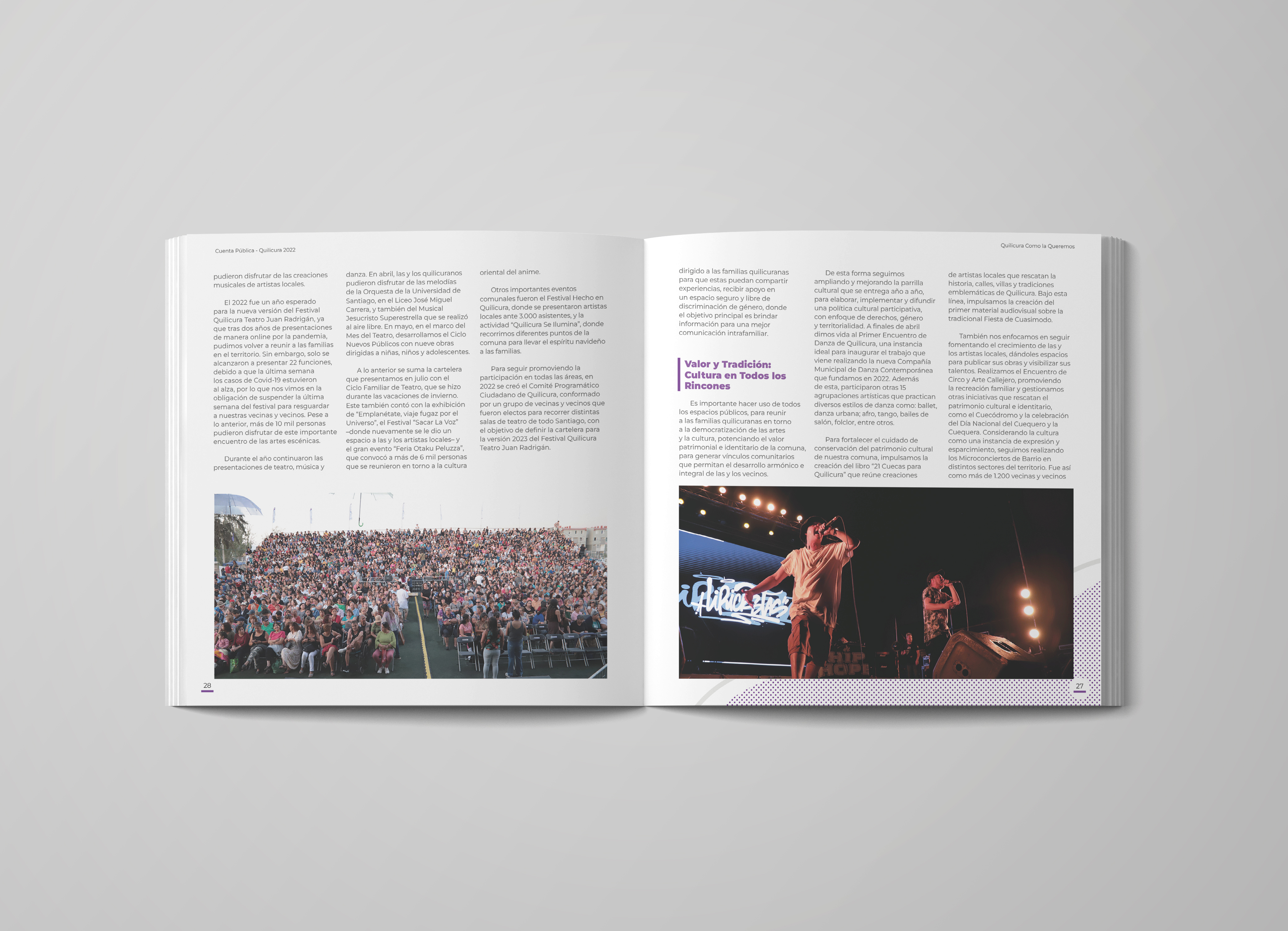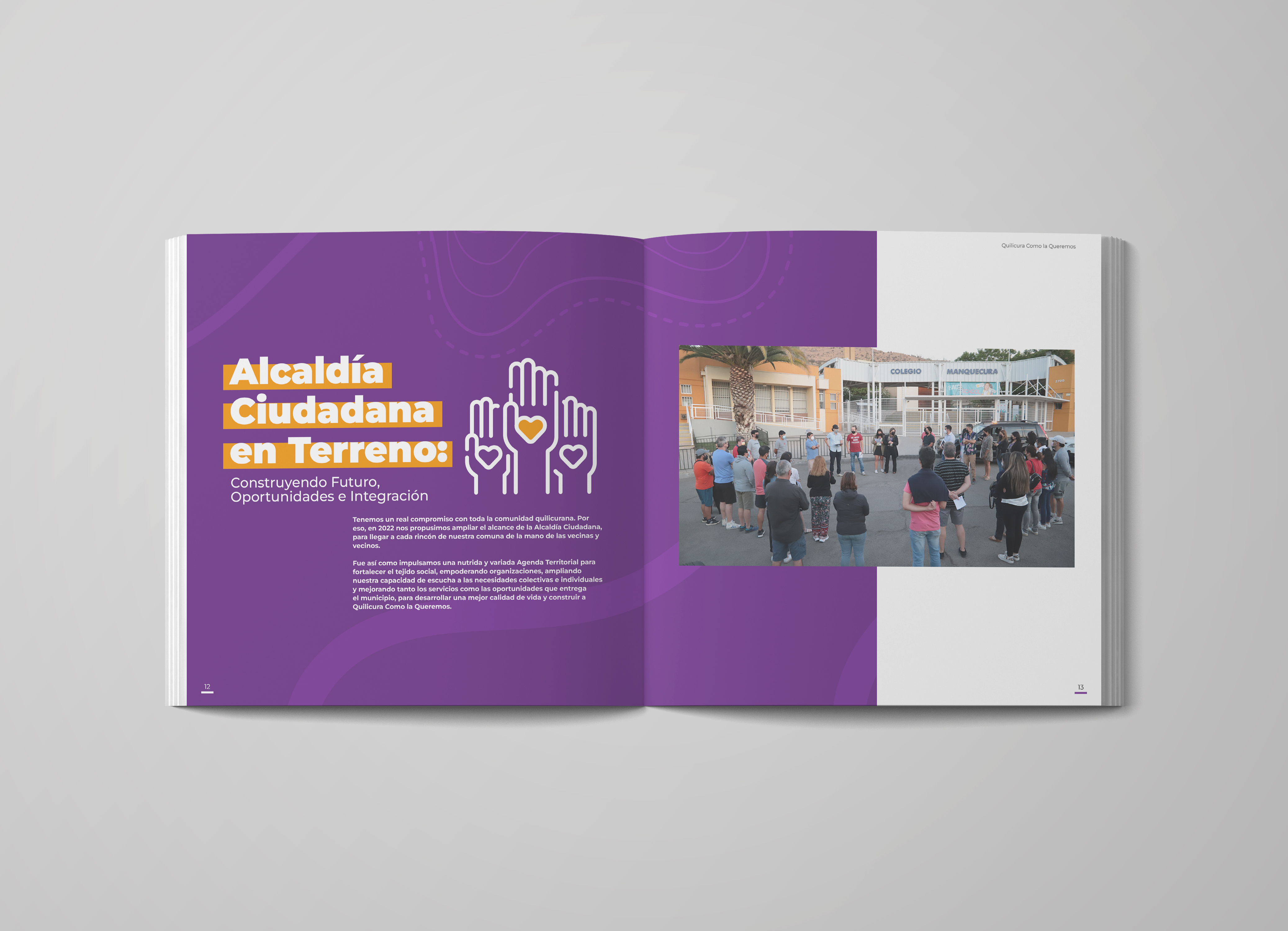 Colaboré en la concepción y producción del libro junto al equipo de comunicaciones, periodistas y audiovisuales, liderando la dirección de arte y la propuesta gráfica. Fui responsable de la diagramación y diseño del contenido en InDesign, así como de la creación de archivos originales y la gestión del proceso de impresión con el proveedor externo. Además, supervisé la revisión de maquetas y la aprobación de color, garantizando la calidad final en todas las etapas de producción. El resultado fue un libro de cuenta pública municipal que refleja fielmente la gestión y los logros alcanzados durante el periodo reportado, destacando tanto en su contenido como en su diseño visual